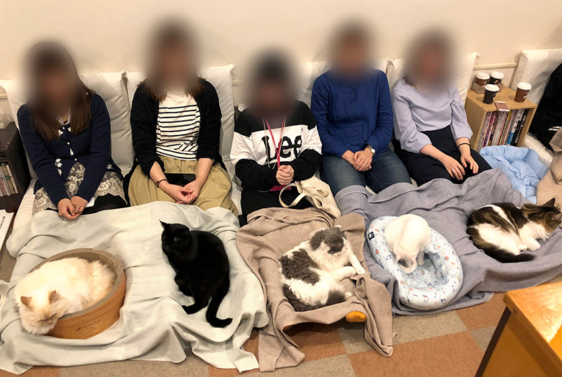 自由に部屋中を歩き回る猫たちに、皆癒された様子です。